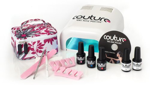 The Invincible 3-Week Manicure! The complete at home Gel Nail Polish Kit with UV light. The Couture Gel Nail Polish kit comes with complete with UV light, base coat, top coat, manicure kit, instructional dvd and one color of your choice. Kit includes UV light, manicure kit, base coat, top coat and one color of your choice Easy Application Dries Instantly Lasts Up to 3 Weeks Free of Harmful Chemica